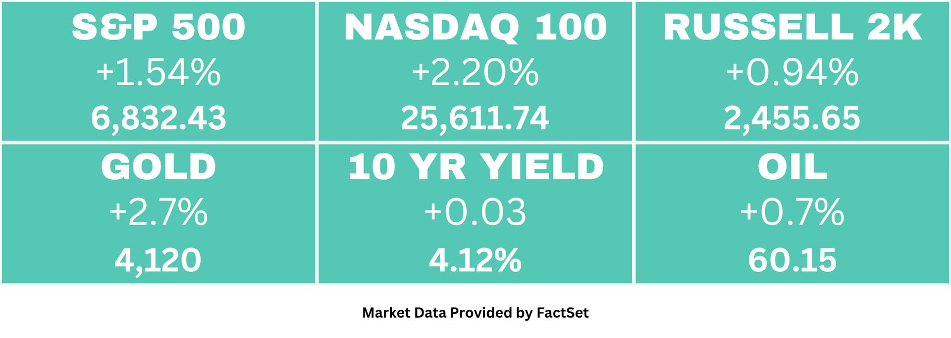 Stocks extended Friday’s bounce on hopes for an end to the government shutdown, with more gains today as those deals come into clearer view. Big-cap tech and the Nasdaq led the way, with the only sectors like staples and real estate left in the red. On the day, SPX +1.5%, QQQ +2.2% and IWM +0.9%.